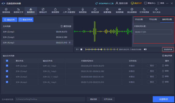 按时间分割:选中音频,在右侧选择“按时间分割”功能,在“片段时间长度”中输入分割时间数值,并“添加到列表”中。