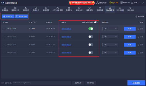 单个文件:选中音频,点击“添加”按钮即可导出添加背景音后的音频文件。 多个文件:点击右下角的“全部添加”按钮,可批量导出多个添加背景音的音频文件。
