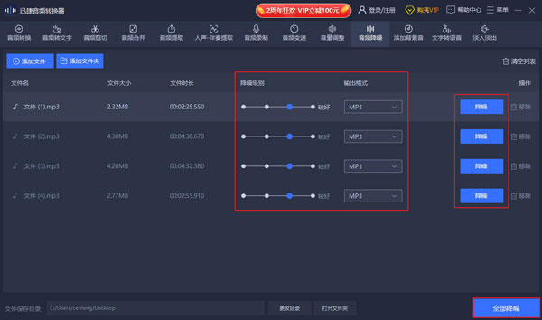 单个文件:选中音频,点击“降噪”按钮即可导出降噪后的音频文件。 多个文件:点击右下角的“全部降噪”按钮,可批量导出多个降噪后的音频文件。