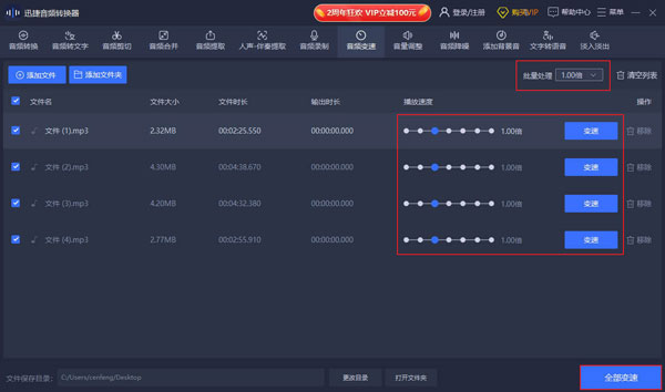 支持批量导入音频文件调整音频播放速度,可任意选择播放速度。
