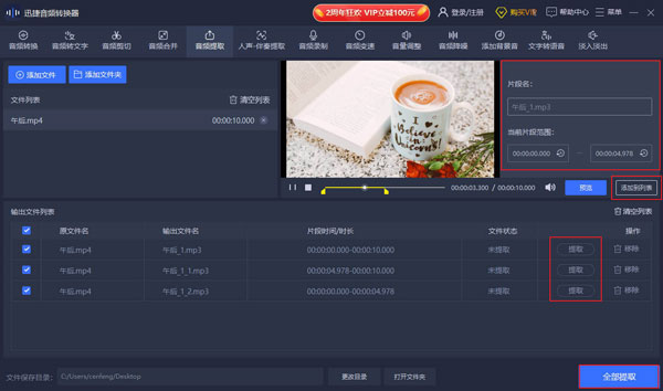 3、音频提取时如何提取其中一段?