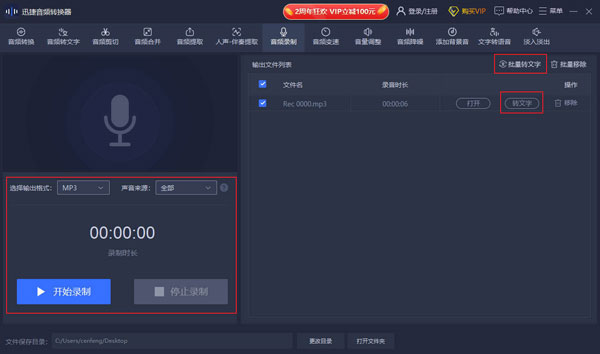 持录制电脑系统声音、麦克风声音,1:1高度还原录制声音内容。并且软件还提供了批量转文字功能,满足音频转写需求。