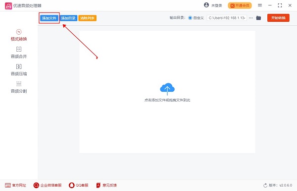 2、在如图所示的左侧功能栏里,选择你要处理的格式,如格式转换、音频合并,或是音频压缩、音频分割,选择完成后,点击左上角的添加文件或者添加目录,选择要处理的音频即可。