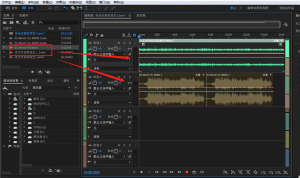 4、会话创建完成后,将左侧的音频文件分别拖动至相应的轨道上。