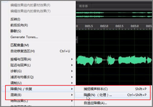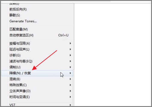然后在再菜单中找到 效果→降噪/恢复→降噪(处理);