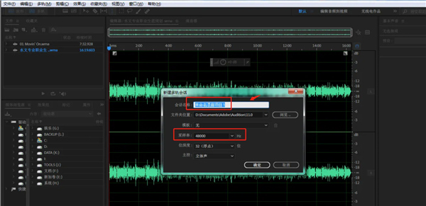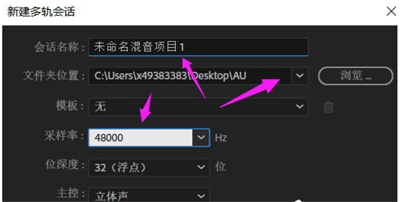 3、在弹出的新建多轨会话窗口中,填写会话的名称和音频采样率。