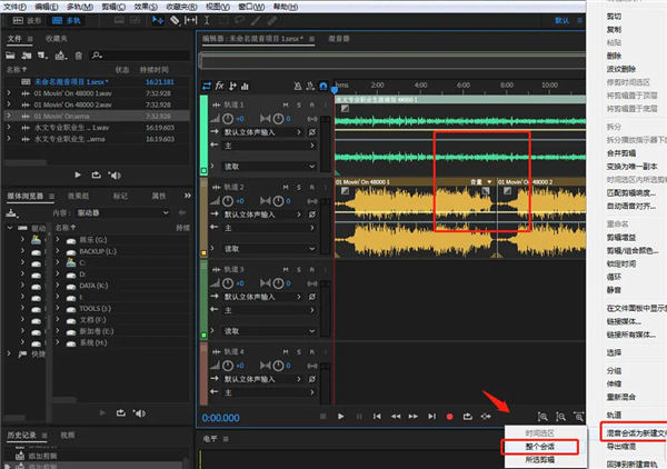 5、按住“ctrl”键,使用鼠标左键选中所有轨道上的音频文件,点击右键,在弹出的窗口中点击“混音会话为新建文件”——“整个会话”。