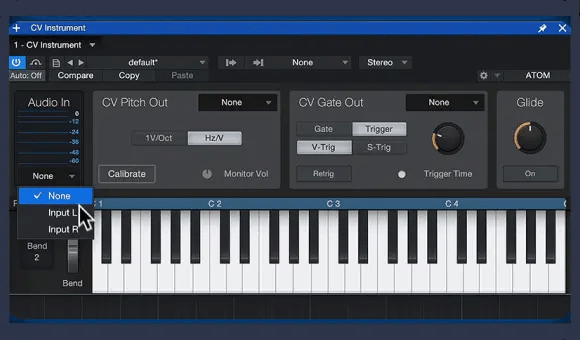 当与兼容的多输出音频接口结合使用时,CV 乐器可以将来自乐器轨道的音符触发和音高信息转换为模拟触发信号和控制电压信号,并从指定的接口输出直接发送到合成器的控制电压输入端。