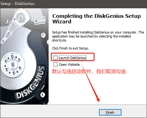 2、安装路径记一下后面破解需要用到;安装完成后,先不运行软件,如下图所示取消掉启动diskgenius