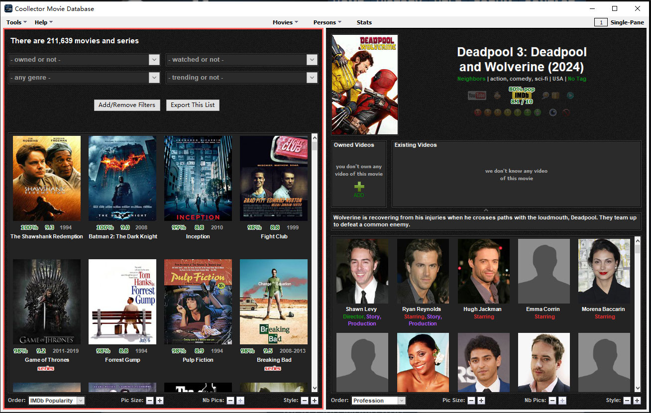你可以改变所有你所了解(从卓越的到糟糕的)的电影和人物。你可以谈论在你所拥有的收藏当中包含电影的技术细节。你可以保持对借出电影的跟踪。你可以管理你的希望列表。
