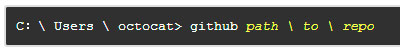 2、要将GitHub Desktop启动到上次打开的存储库,请键入github。要为特定的存储库启动GitHub Desktop,请使用github命令,然后使用该存储库的路径。
