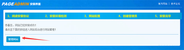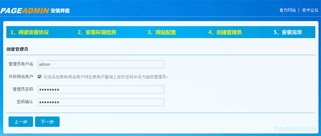 2、第一次安装PageAdmin,默认打开PageAdmin的安装界面,如下图: