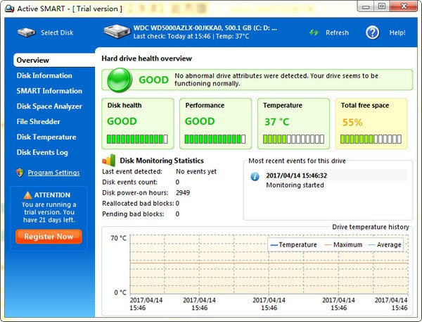 Active SMART是来自国外的一款知名硬盘检测工具。集硬盘诊断和健康状态监控为一身,使用SMART技术来监控硬盘驱动器的运行状况、性能、温度、可用空间和其他重要参数。
