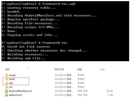 apktool b xxx →这是回编译命令。xxx就是反编译后的文件所在文件夹,这个文件夹一般是以之前反编译的文件名为名称,例如我反编译SystemUI.apk,就会在E:/apktool目录下生成一个SystemUI文件夹,回编译命令就可以这样写“apktool b SystemUI”。回编译完成会在SystemUI文件夹生成一个dist文件夹和一个build文件夹。dist文件夹里面存放的就是回编译后不带有签名的apk文件,build文件夹里面还有一个apk文件夹,里面存放的就是回编译后没有打包成apk的文件。