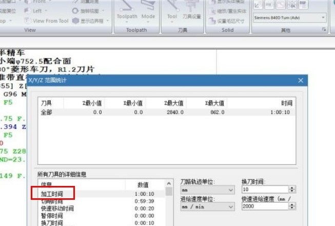 2、点击这个按钮之后就会打开一个X/Y/Z范围统计的界面,然后在界面左边的所有刀具详细信息模块中,我们就可以查看到程序的加工时间这个选项了,如下图中所示。