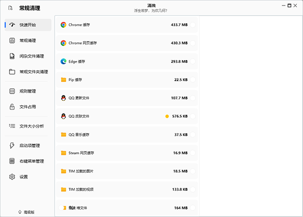1、常规清理: Chrome缓存、Chrome网页缓存、edge缓存、qq音乐缓存、崩溃堆文件、系统临时文件