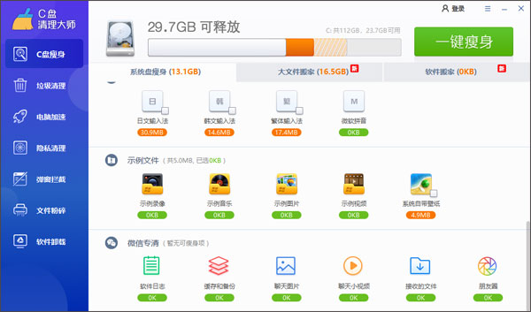 2、可以帮助用户对系统盘进行一键瘦身,清理系统盘虚拟内存,补丁备份,软件垃圾等。