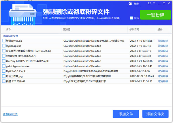 强制删除或彻底粉碎文件,您可以彻底粉碎无法删除的文件或文件夹,粉碎后将无法恢复。粉碎文件主要是将回收站里面的文件进行全部粉碎,这样就不会有残余垃圾留下来了。