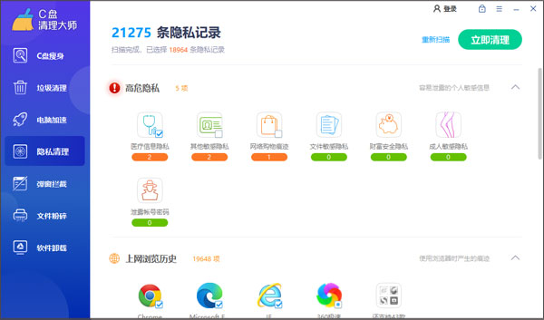 隐私清理则是从高危隐私、上网浏览历史、影音播放痕迹、系统使用痕迹、软件使用痕迹以及下载历史痕迹等方面检测,将影响自己隐私的因素全部清理掉。
