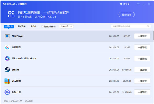 我的电脑我做主,—健清除顽固软件。在搜索框中输入想要卸载的软件然后一键全部卸载,你还可以将隐藏系统软件找出来进行卸载,非常实用。