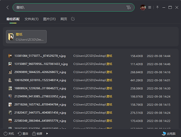 当你记不清具体文件名,但又需要查看指定格式文件时,采用此方法可以帮你快速找到,如:输入 壁纸 png ,即可查看本机电脑上文件名包含“壁纸”的 png 文件。