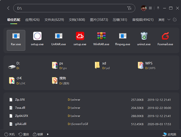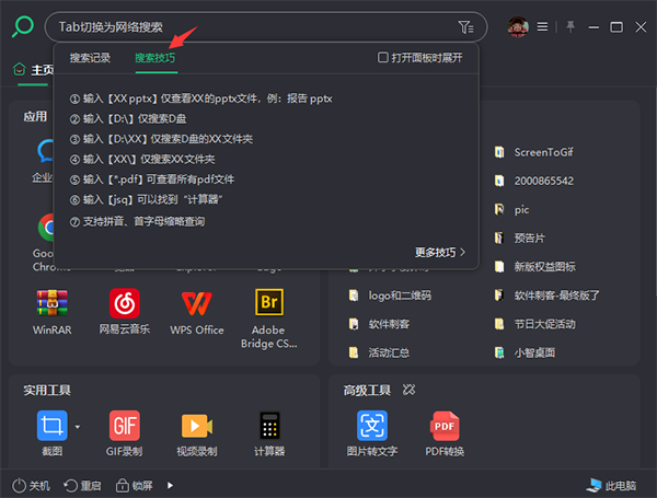 为了让用户快速找到想要的文件,小智搜搜提供了一些简单实用的搜索指令,支持快速搜索系统盘符、文件或应用等。