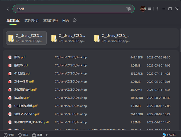 当你想要查看本机电脑上某一格式的文件情况时,输入 *.文件格式 即可查看本机电脑上包含该格式的所有文件,如:输入 *.pdf 可以查看所有pdf文件。