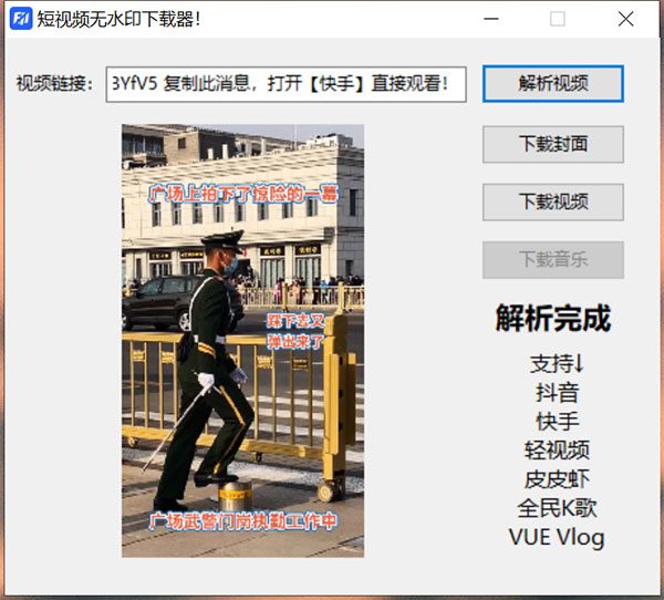 4、快手视频也是一样的,解析非常快速,下载也方便,单独的下载封面/音乐也是没有任何问题的。