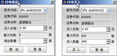 (3)在预警列表上双击“价位下破”或者“价位上破”的股票项,将弹出闪电卖出或者闪电买入的对话框,如下图: