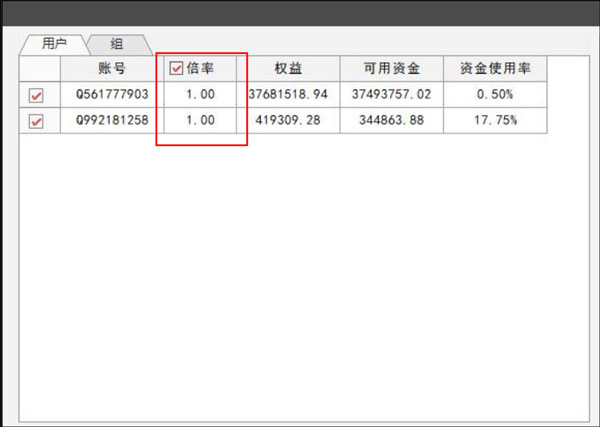 4、用户栏内,可查看登录账户信息,勾选相应账号,点击倍率内数字,设置相应下单倍率,后续以多账户进行下单交易,区别于按组下单。各账号实际交易手数=下单设定手数*下单倍率。