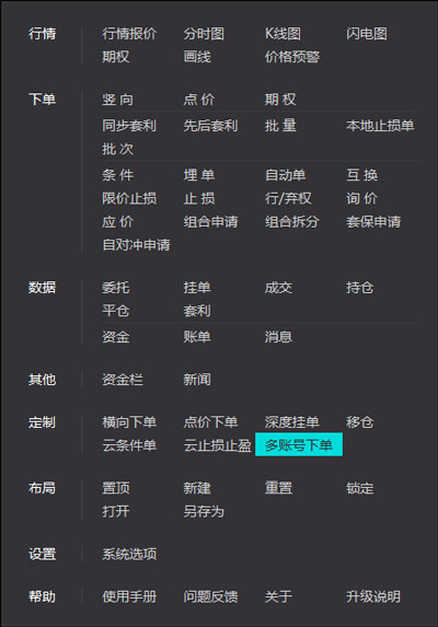 可在右侧菜单栏定制栏中选择“多账号下单”,如图。