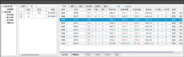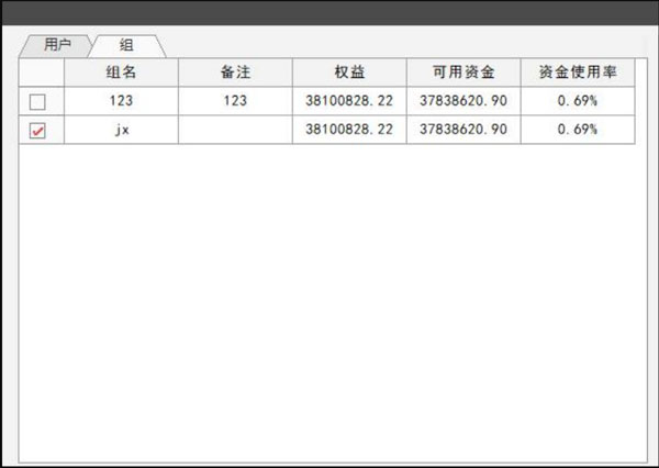3、用户和分组信息栏可显示各账号、各分组信息。分组信息包括各组总权益、可用资金和资金使用率情况,具体分组可点击左侧菜单栏设置分组内设置。勾选相应分组,后续下单即以该组进行下单交易。