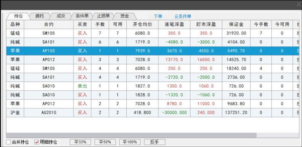 6、持仓栏内可选择合并持仓即某一组内各账号合并持仓情况,或明细持仓,即将组内各账号持仓分开显示。如图所示。