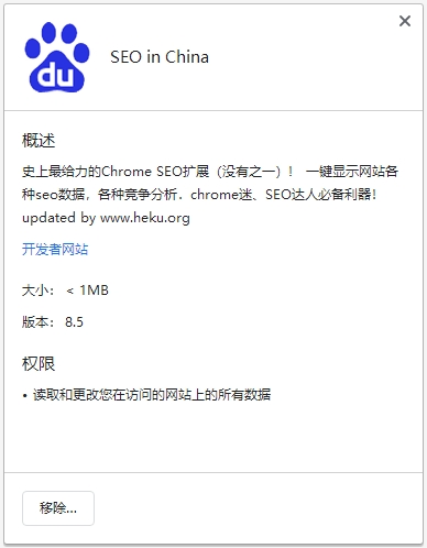 这个SEO in China Chrome插件是个挺实用的工具,专门给做SEO的人用的。它能在谷歌浏览器里显示网站的各种SEO数据,还能做竞争分析,支持查百度收录、Google收录、pr值、百度权重这些指标,功能挺全面的。安装起来也简单,直接拖到浏览器里就能用,不过装完后会有提示确认,点一下就行了。