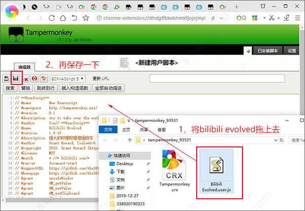 3、先将编辑器上的内容全部删除,再将bilibili evolved脚本文件拖上去,再保存一下即可安装好;事实上直接将文件拖到浏览器上即可以安装;
