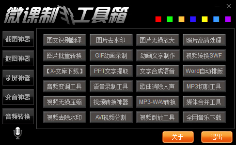 微课制作工具箱是一款功能强大的制作微课的课程制作软件,集多种免费软件于一体,全面辅助广大教师开发制作微课教学视频。该软件拥有直观的用户界面,运行稳定,集成工具达到37个,能够实现上百种功能,可以下载全网所有的音乐以及课件,亦或是免费的视频素材用于剪辑,而且自带多种功能,无论是剪辑还是配音,甚至还有调音PS功能,都非常好用,可以满足用户的日常使用需求。此外,微课制作工具箱可以与慕课平台软件结合使用,实现微课视频一键发布、多终端展示、在线学习、在线互动教学等功能,实用性非常强,如果你正需要一款软件的话,那么快来下载试试吧。