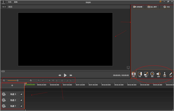 7、主要包括三个分功能板块,上部的左边是视频播放窗口,上部的右边是添加素材和对素材的特效进行设置的部分;下部主要是对素材进行编辑处理的功能按钮和放置素材的轨道;