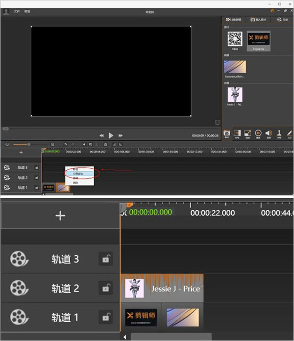 8、将导入到素材库的素材比如视频先添加到轨道1上,然后在轨道1上同时可以添加相应的开始和结束的图片,如果要分离出视频中的音频并添加其他音频,可以右键选择分离音轨,然后拖动音频到轨道2上;