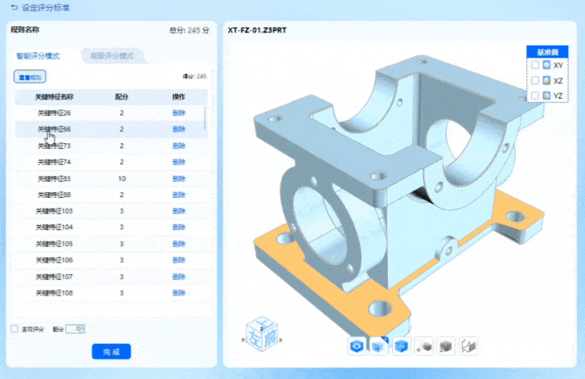 涵盖了机械类三维建模考题所需的评分方式,包括按照模型的关键特征、模型体积、面积、面的数量评分,设置加分、扣分评分制,科学设置评分项,体现评分的专业性和多场景化的兼容性,将教学标准和大赛标准融通。