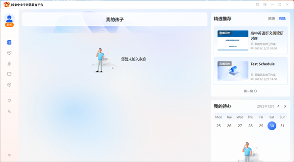 不管是学生还是家长在加入班级时,首先需要确认所在学校的管理后台是否进行了个人手机号绑定注册,只有在学校管理后台有账号信息才可以在电脑版上进行加入班级,例如下图所示,如果家长没有在学校管理后台进行手机号绑定注册就会在登录后显示为您暂未加入家庭的文本提示
