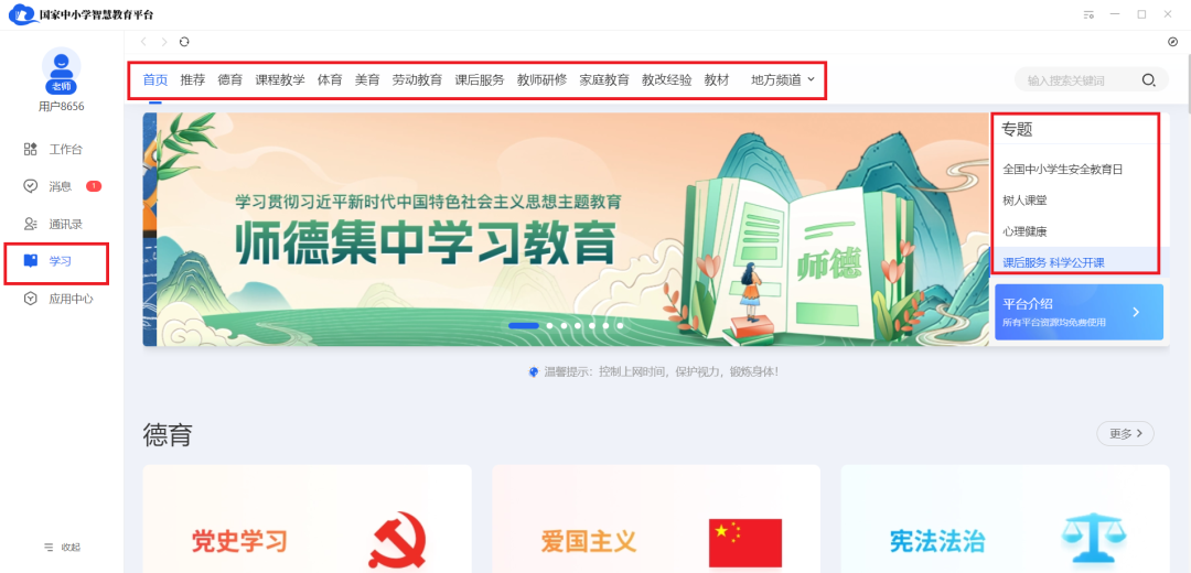 7、通过点击左侧的主要功能栏中的“学习”按钮,可以进入学习界面,进行课程教学、课后服务、教师研修等板块的学习,同时可以查看各项专题活动。