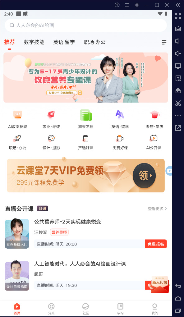 网易云课堂电脑版是一款借助模拟器运行的专注于成人终身学习的在线教育app。该软件主要针对成年人职业发展和自身技能提升,而且围绕考试考证、职场技能、兴趣副业、英语能力,提供了网易有道自主研发的精品课程、以及来自业内优秀教育讲师、教育机构的严选课程。