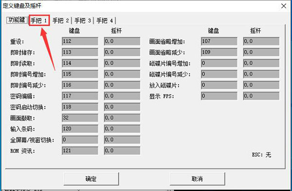 2、然后在定义键盘及摇杆界面,选择【手把1】。