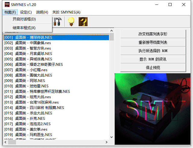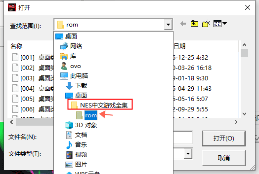 2、点击档案菜单下面的“开启对话框”,选择nes中文游戏全集目录下的rom文件夹。