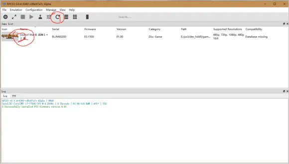 5、游戏就已经放进ps3模拟器里面了,接下来就是打开ps3模拟器,先点击图示中的1,就会在列表里面得到2战神游戏的图标;