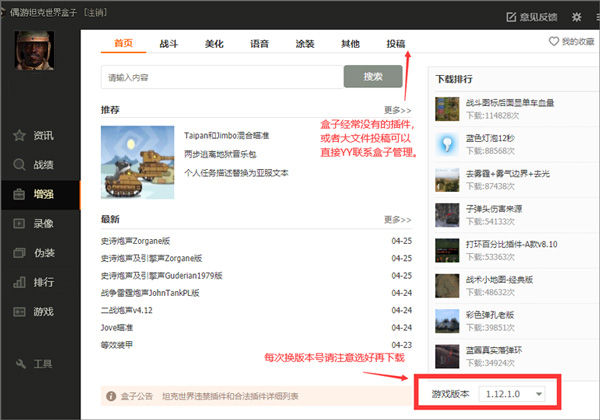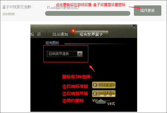 安装偶游坦克世界盒子后,盒子下面【插件更新】按钮更新即可。游戏设置里盒子设置可自行设置“巨响标准”“巨响装甲”“简约版”3种图标。战斗力默认显示不需设置。