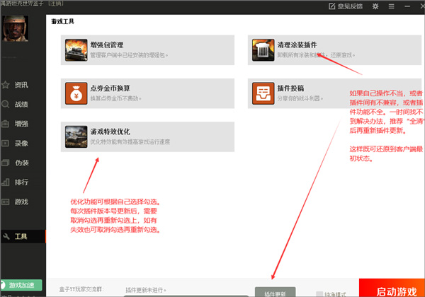 该功能可在盒子界面【工具】-【游戏特效优化】菜单使用,勾选即可生效。如有遇到插件全清或版本更新,请取消勾选再重复勾选上会继续生效。
