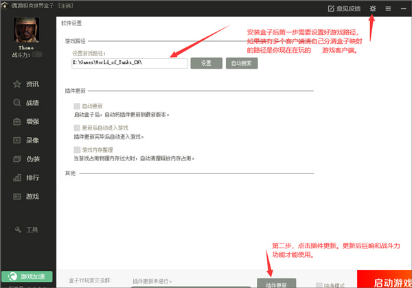1、安装盒子后第一步需要设置好游戏路径,如果装有多个客户端,清自己分清盒子映射的路径是你现在在玩的游戏客户端;第二步点击插件更新,更新后巨响和战斗力功能才能使用。