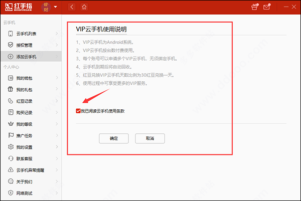 3、点击“VIP云手机”按钮,进入VIP云手机使用说明界面,勾选“我已阅读云手机使用条款”,并点击“同意”。