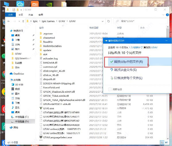 然后将下载下来的补丁文件全部复制到gta5目录中进行替换;